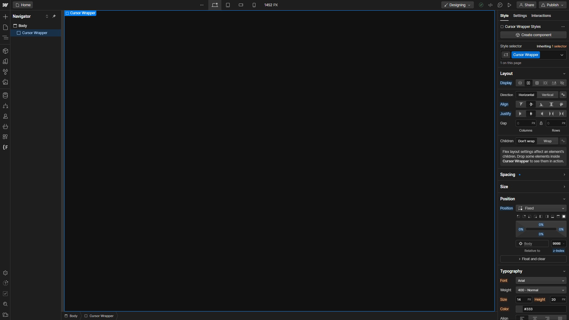 To get started add a Div Block to your Page and give it the Class Cursor Wrapper. Set the Display to Flex and align and justify it to the Center.
