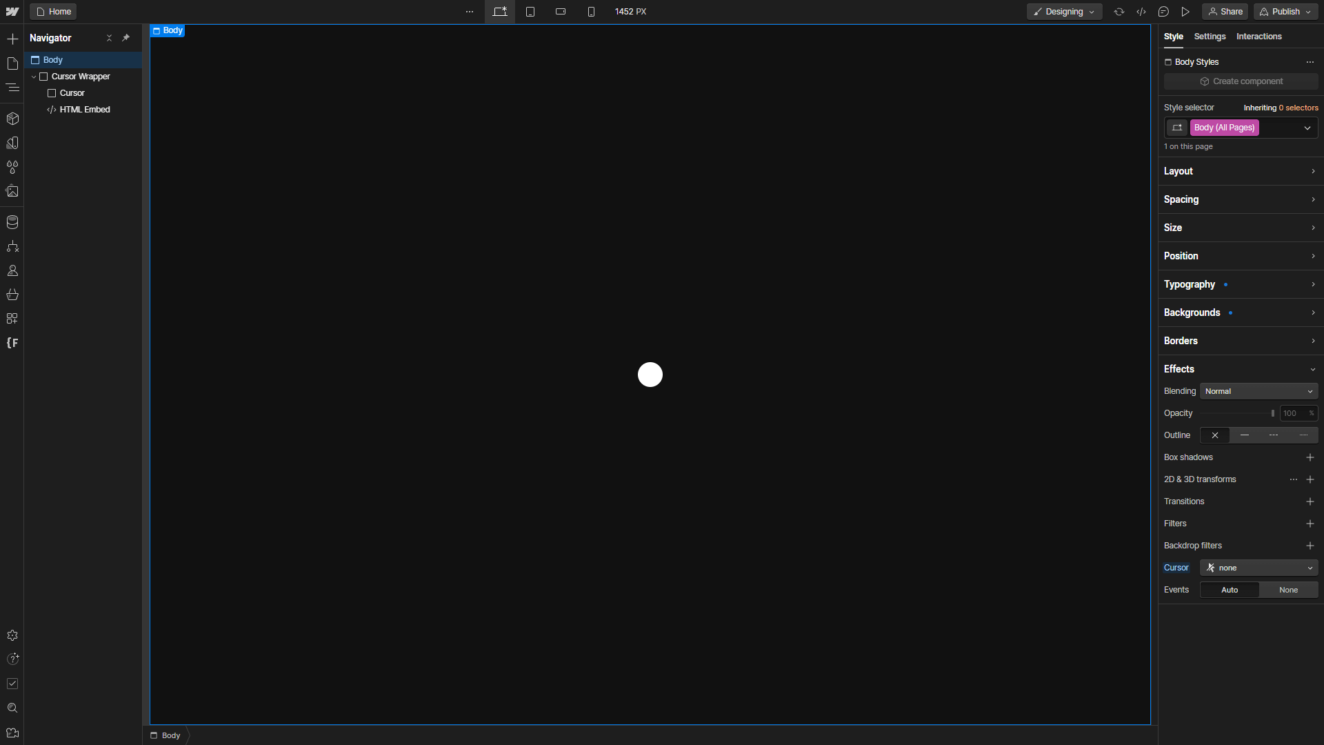 Before we build the Animation, we also have to disable the Default Cursor in the Body Element. Select the Body All Pages Tag inside the Body Element and scroll all the way down in the Style Panel. Set the Cursor to None. Once you start adding Elements like Links, Tabs and so on you will also have to do this Step to each Element as they will have some default Cursor Styling.