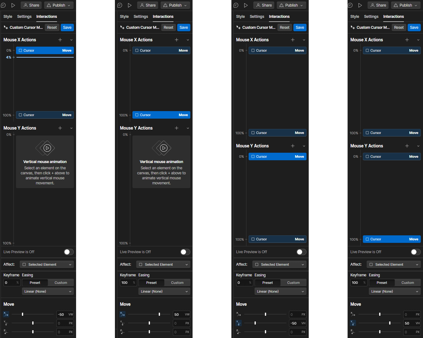 Select the Cursor Class and add a new Move Transform in the Mouse X Actions. Select the 0% State and set the Transform X Value to -50vw. Now select the 100% State and set the Transform X Value to 50vw. If you enable Live Preview you will see that you can now move the Cursor from left to right.