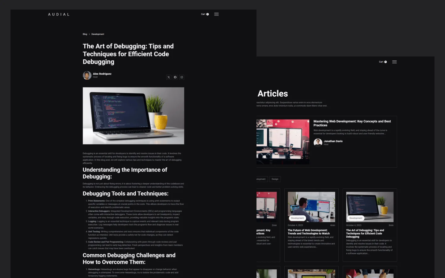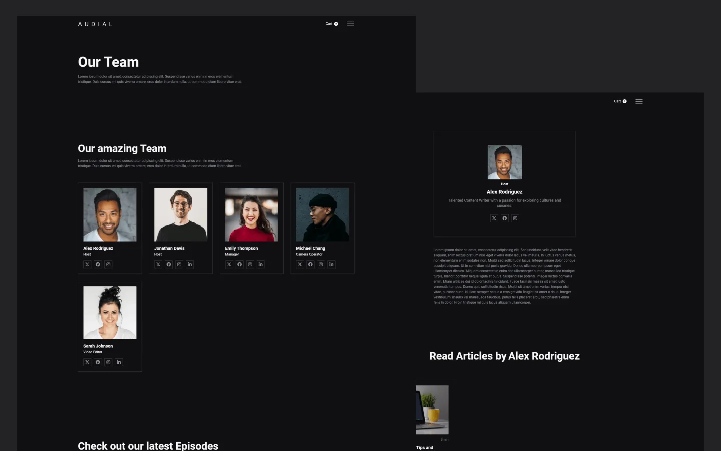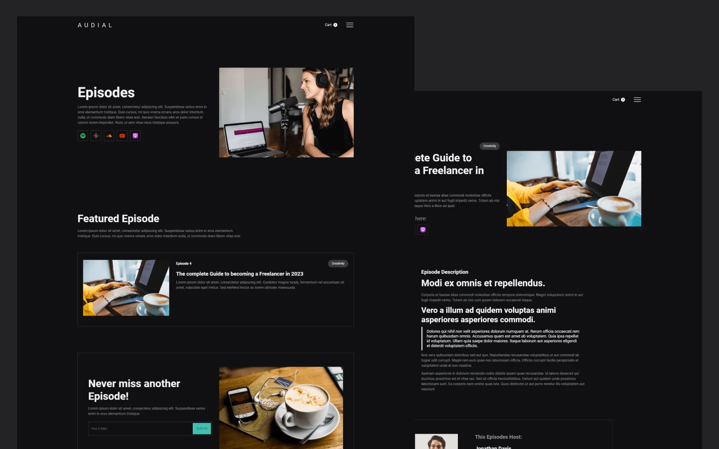 Audial is a dark, minimal Webflow template designed for podcasts. Features sleek design and all necessary pages for podcast websites and audio content creators.