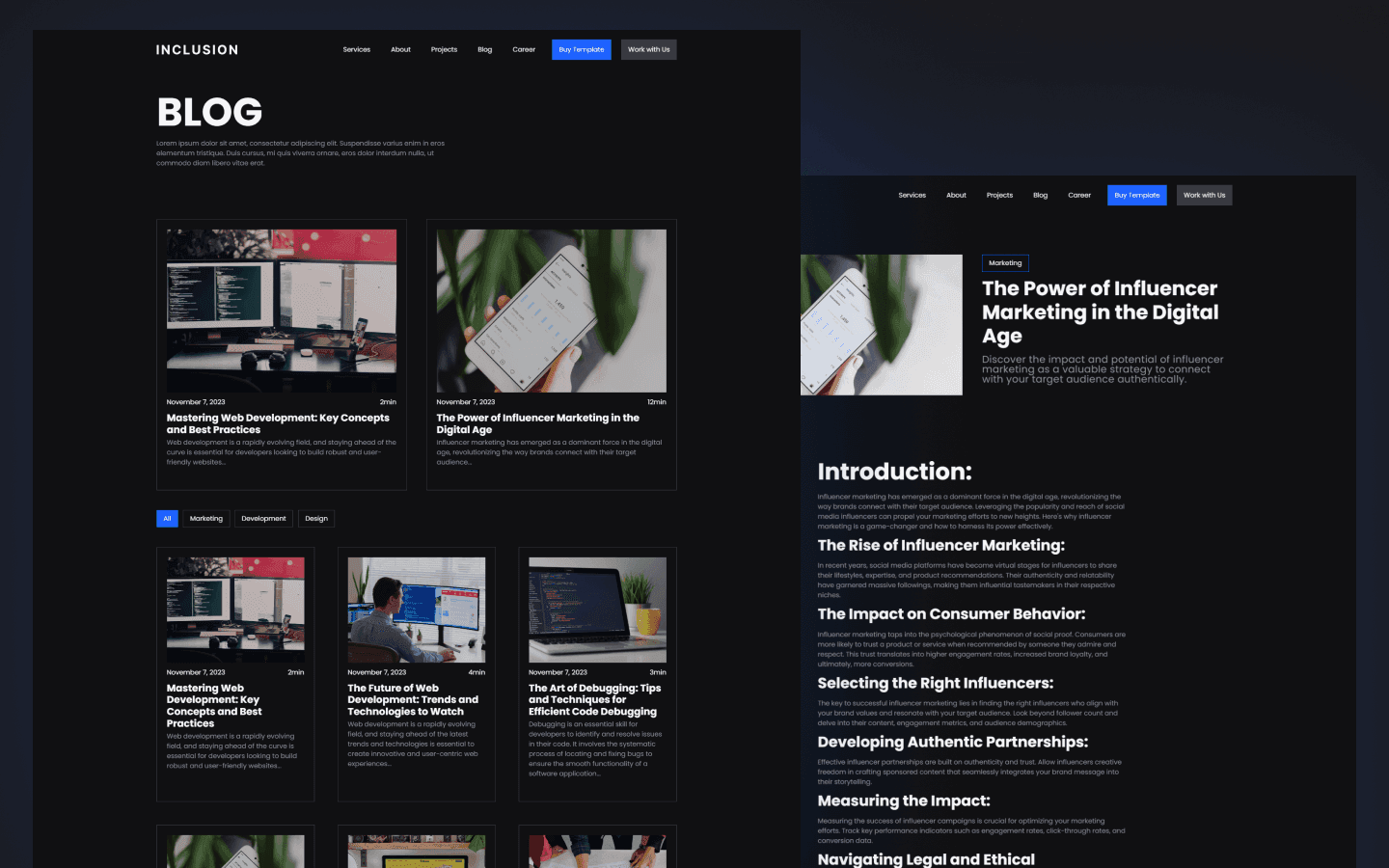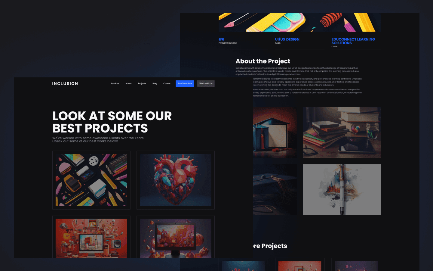 Inclusion is a minimal, dark Webflow template with organic design elements. Perfect for agencies and businesses focused on inclusive, thoughtful design and messaging.
