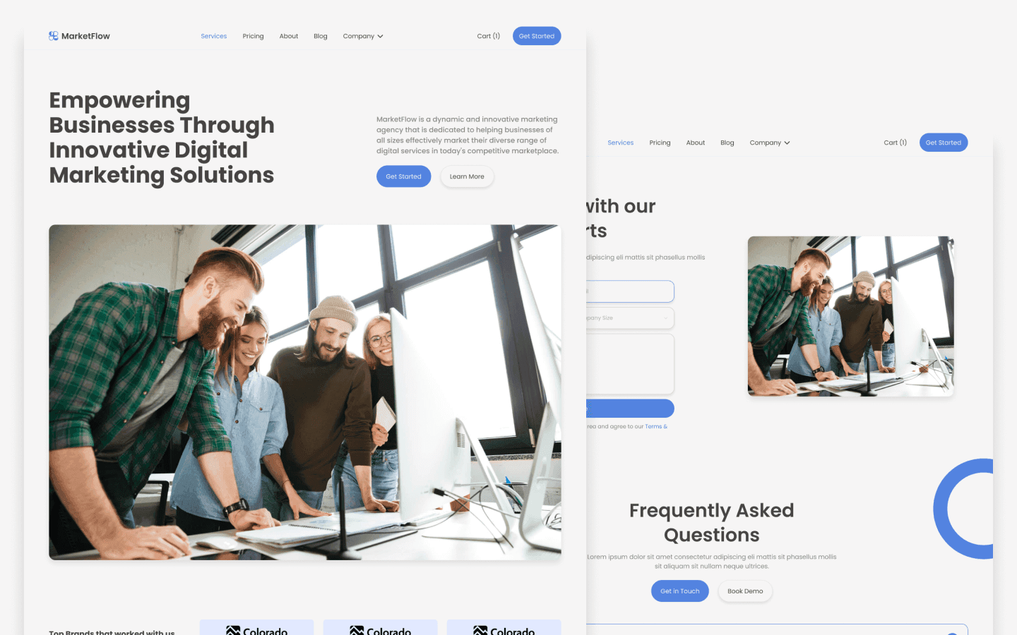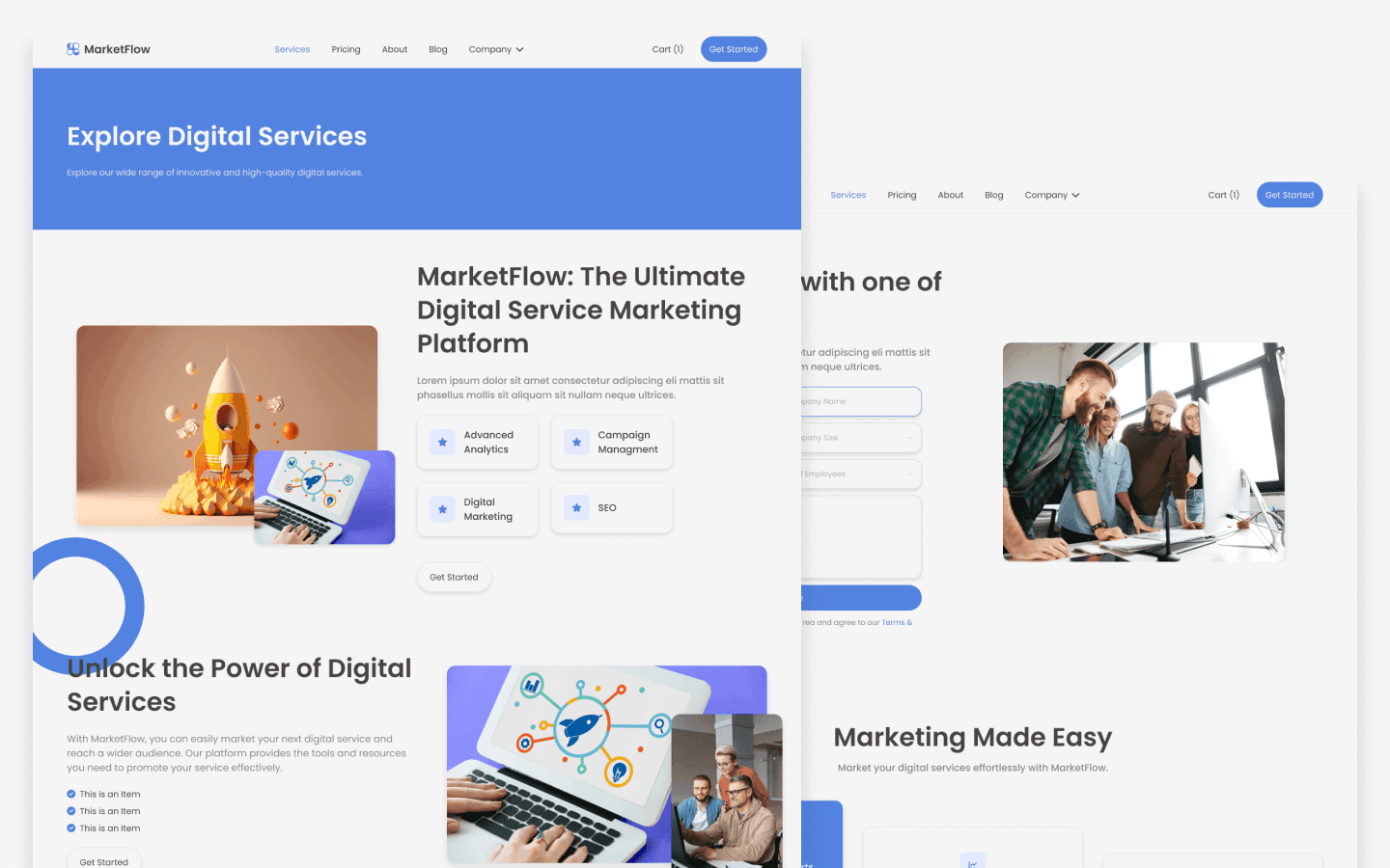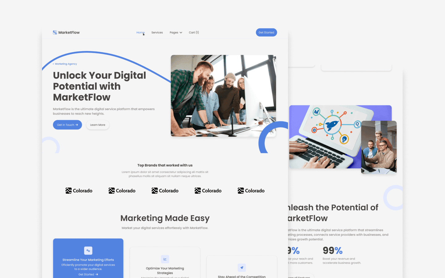 MarketFlow is a modern Webflow Marketing Template with organic design elements and corporate styling. Perfect for marketing agencies and product launches with full CMS and e-commerce support.