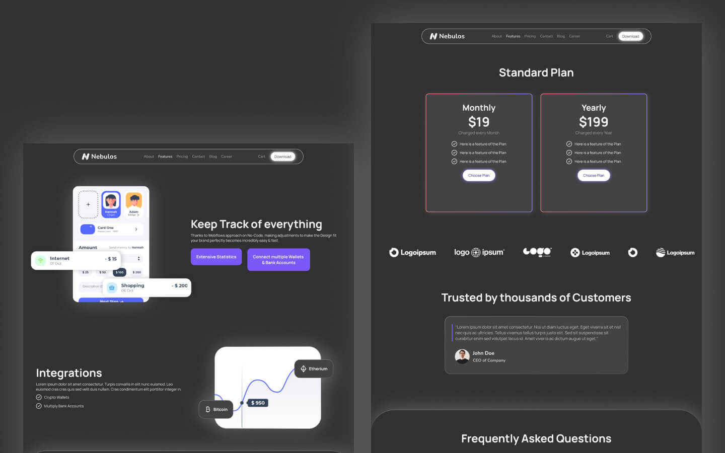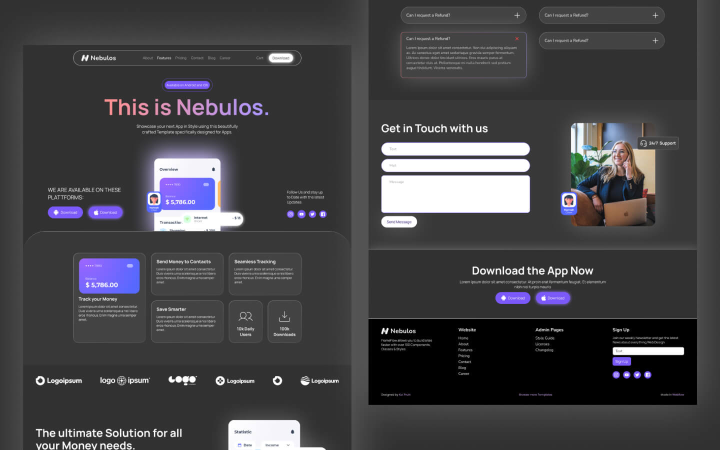 Nebulos is a clean, dark Webflow template for app websites. Features casual design elements and comprehensive functionality for app marketing and presentation.