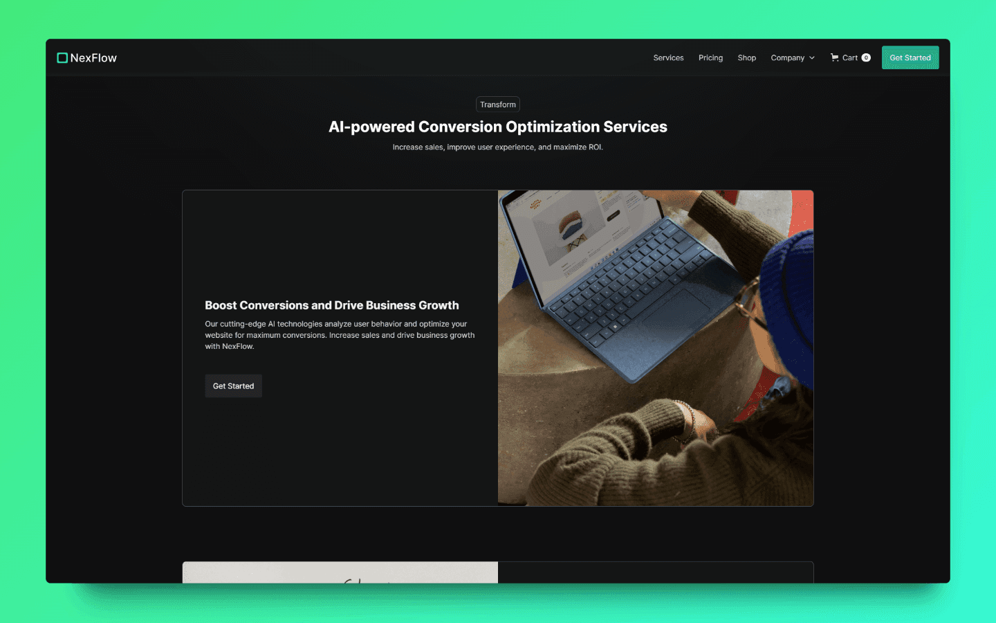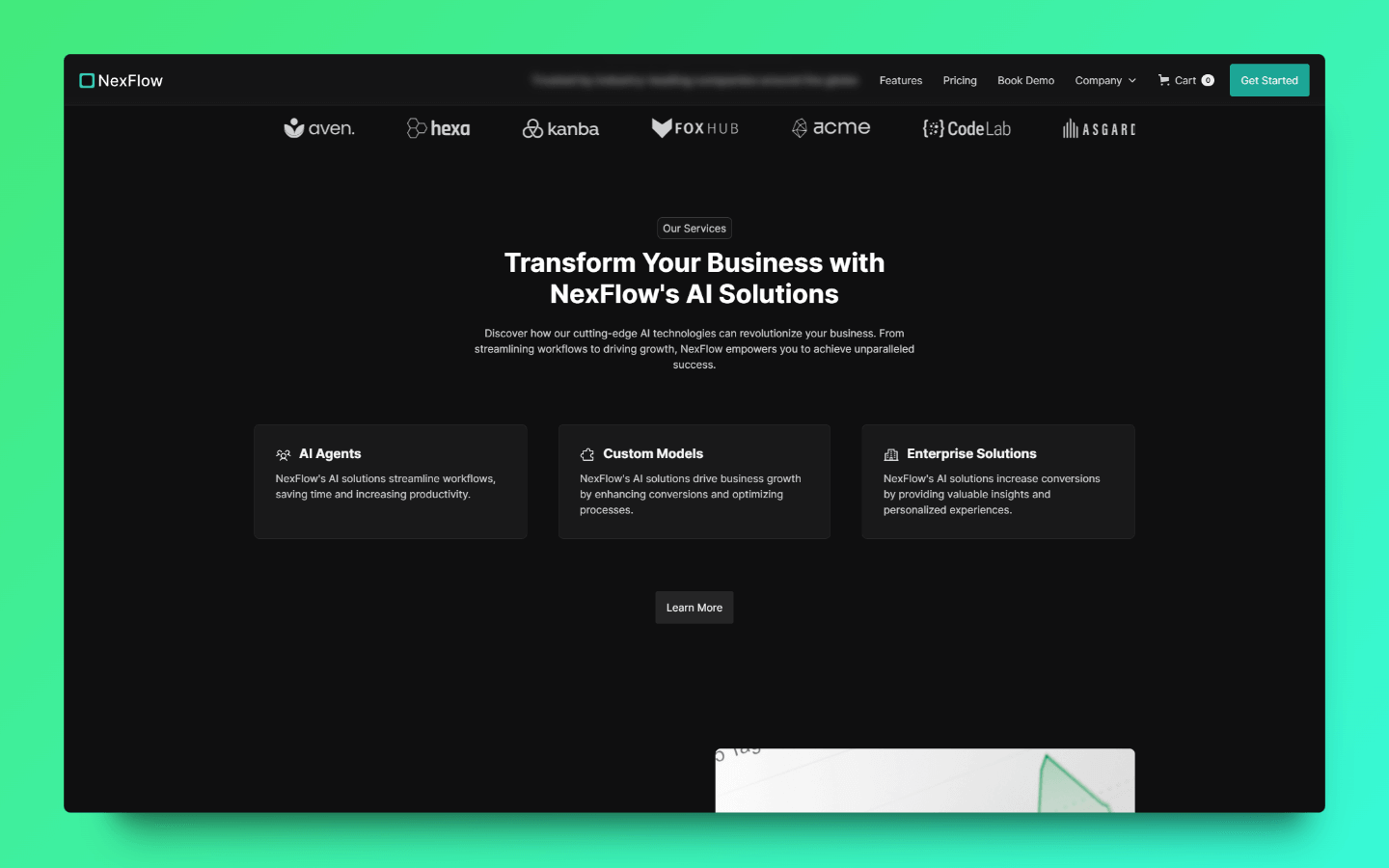 NexFlow is a sleek Webflow template made for AI agencies, marketers, and businesses. Featuring a stunning dark-mode design, 18 clean pages, and full responsiveness, it's easy to edit and perfect for showcasing AI services with style and efficiency.